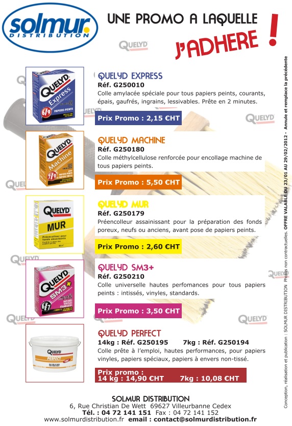 Du 23 janvier au 29 février 2012, votre magasin Solmur Distribution à Villeurbanne vous propose sa nouvelle promotion sur les colles de la marque QUELYD :